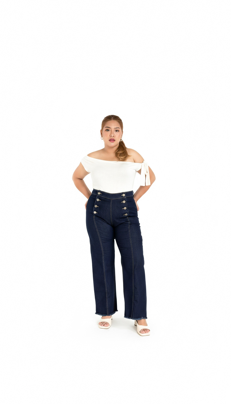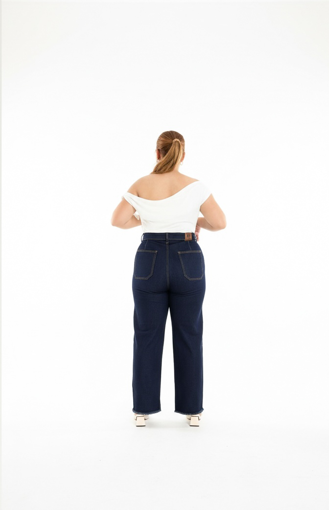 Celana jeans high-waist khusus plus size dengan bahan elastis yang nyaman dipakai seharian.